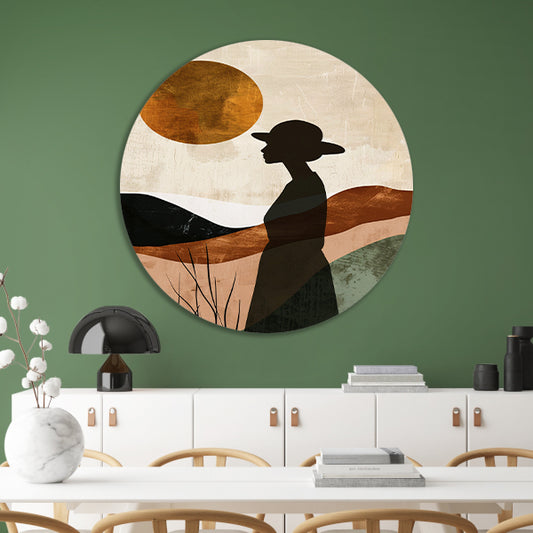 Vrouwelijk silhouet met abstracte natuur en warme kleuren aluminium muurcirkel