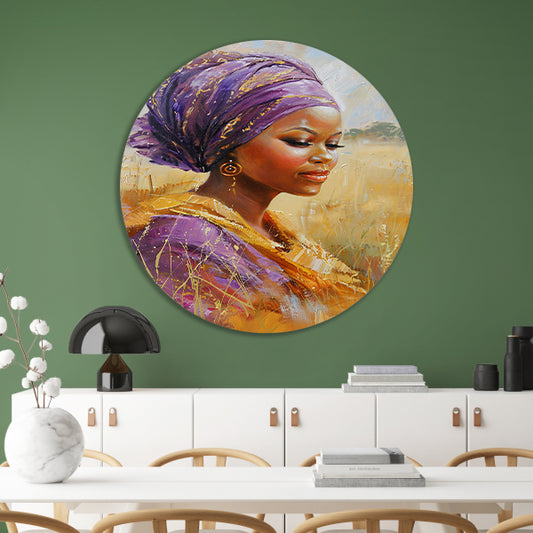 Afrikaanse vrouw met paarse doek en gouden maan aluminium muurcirkel