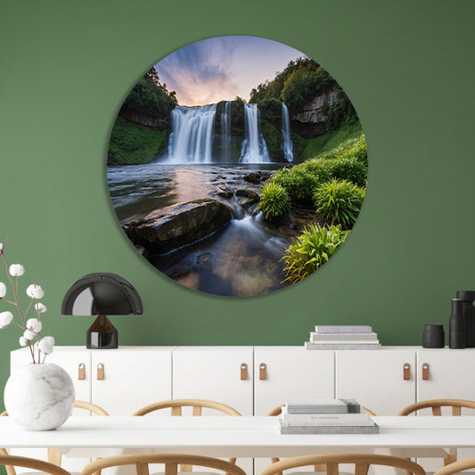 Serene waterval bij zonsondergang aluminium muurcirkel