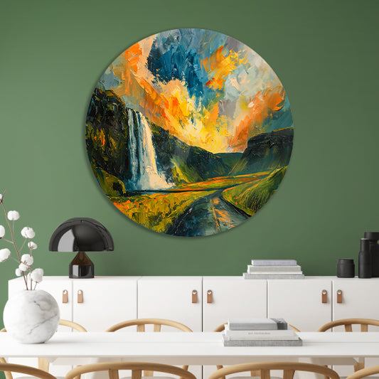 Impressionistische waterval bij zonsondergang schilderij aluminium muurcirkel