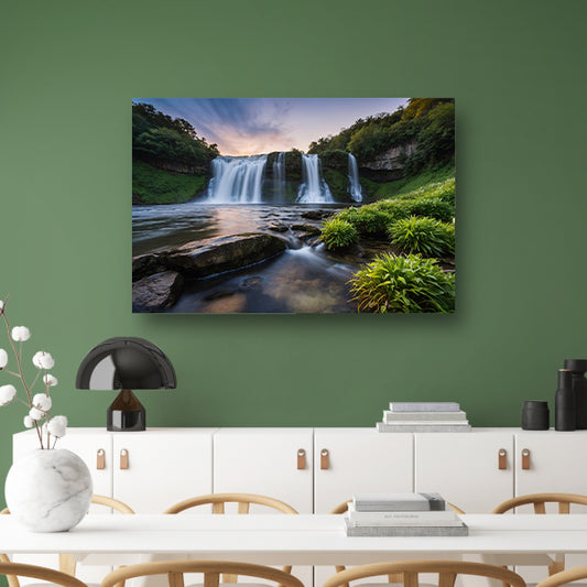 Kleurrijke waterval bij zonsondergang schilderij canvas