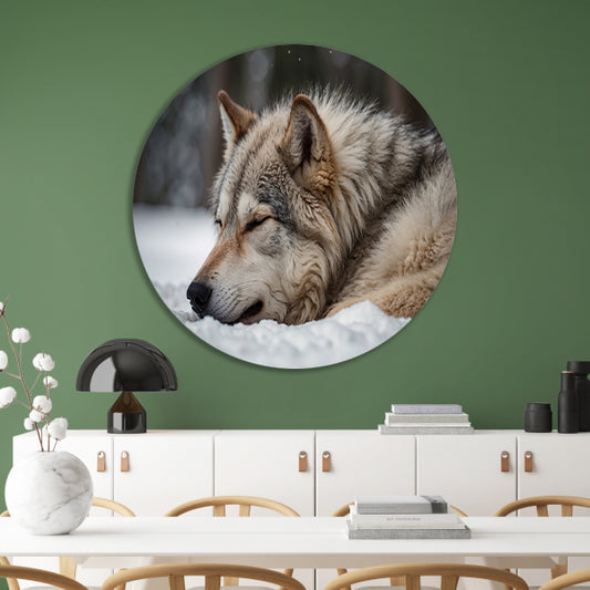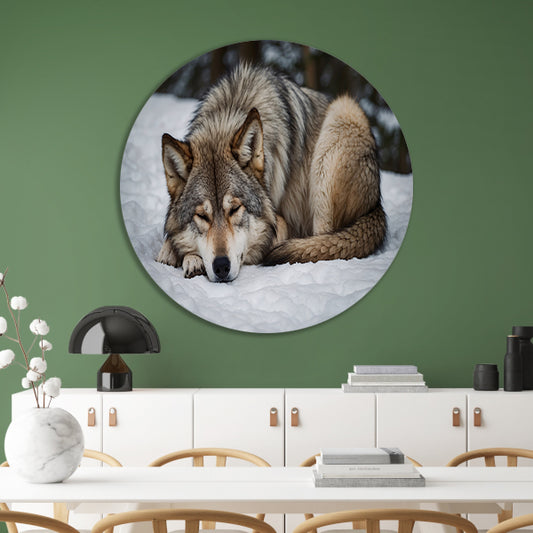 Slapende wolf in winterlandschap aluminium muurcirkel