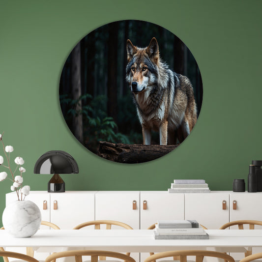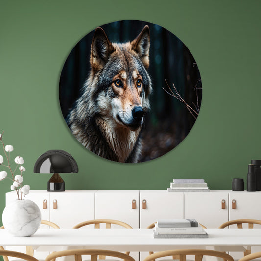 Indrukwekkende wolf in donker bos aluminium muurcirkel