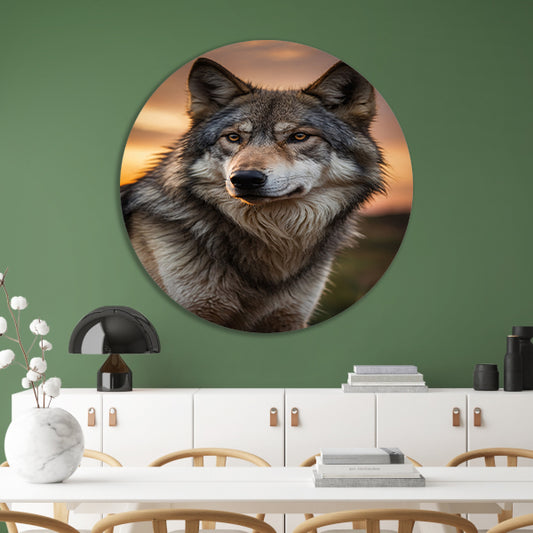 Prachtig wolfportret tijdens zonsondergang aluminium muurcirkel