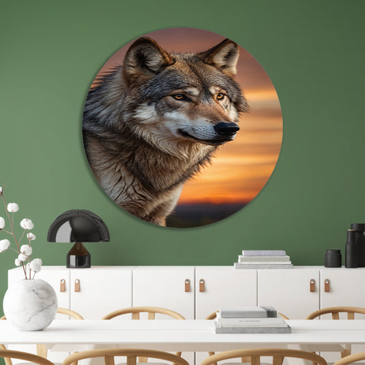 Majestueuze wolf bij prachtige zonsondergang aluminium muurcirkel