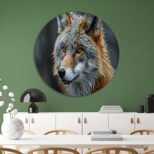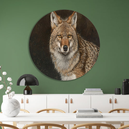 Gedetailleerd realistisch schilderij van een coyote aluminium muurcirkel