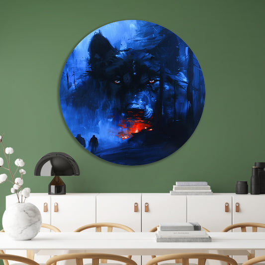 Mystieke wolf met vurige ogen in bos aluminium muurcirkel