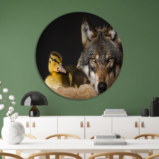 Wolf en eendling: onwaarschijnlijke ontmoeting aluminium muurcirkel