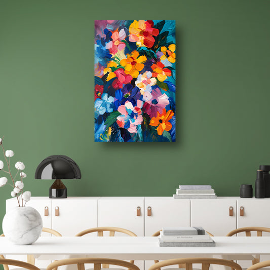 Kleurrijke en abstracte bloemenschilderij met dynamische uitstraling acrylglas
