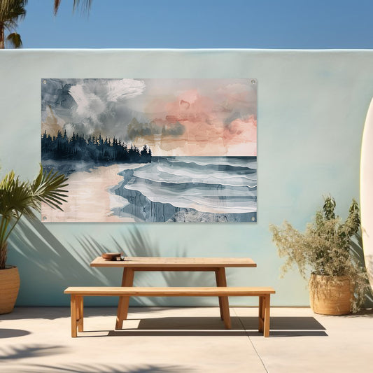 Minimalistisch schilderij van strand bij zonsopgang tuinposter