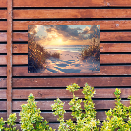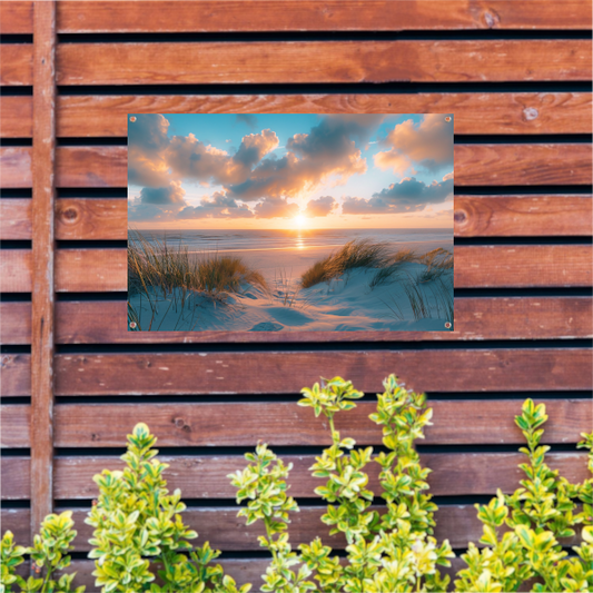 Betoverende zonsondergang op het strand met levendige kleuren tuinposter