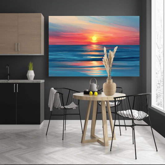 Minimalistische schildering van kleurrijke zonsondergang canvas met baklijst