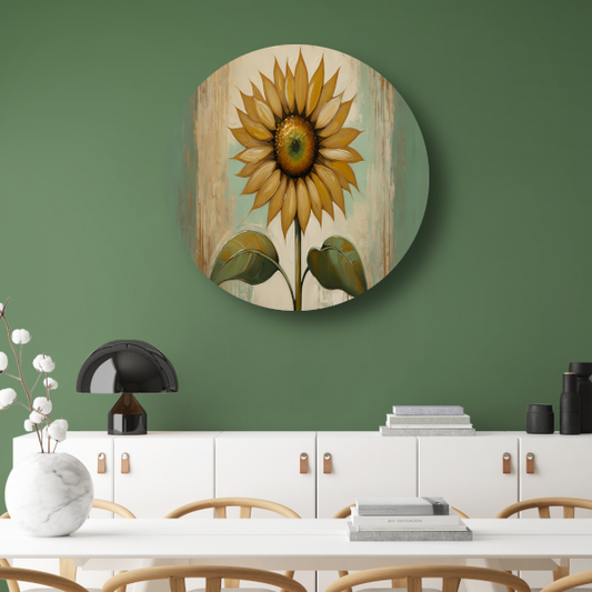 Zonnebloem schilderij met goud aluminium muurcirkel