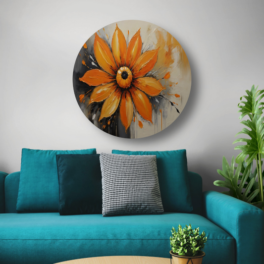 Abstracte kleurrijke zonnebloem schilderij met lijnwerk aluminium muurcirkel