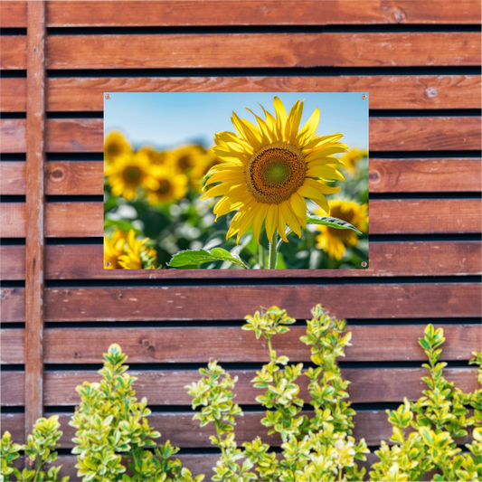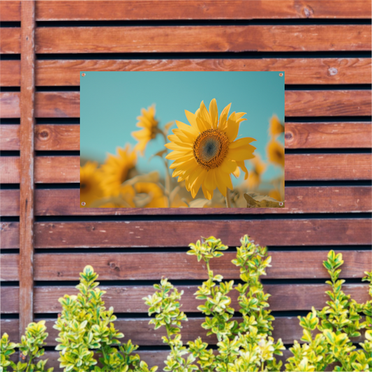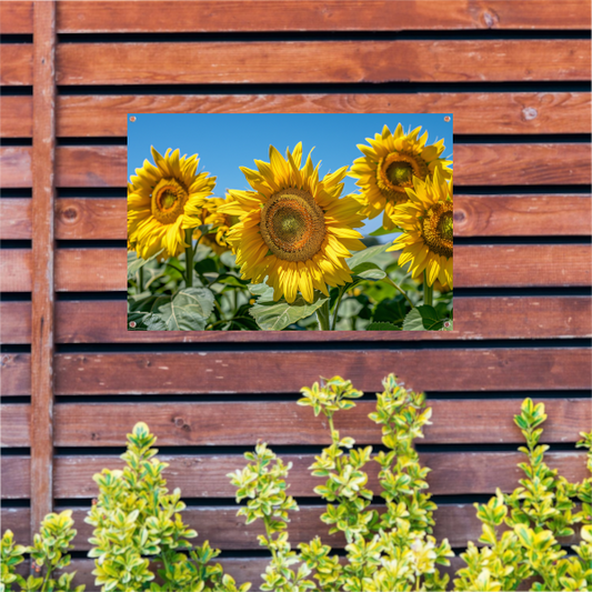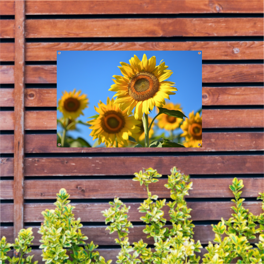 Levendige zonnebloemen onder een helderblauwe hemel tuinposter