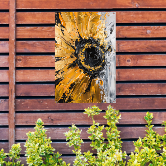 Abstracte zonnebloem in zwart, goud, oranje en wit tuinposter