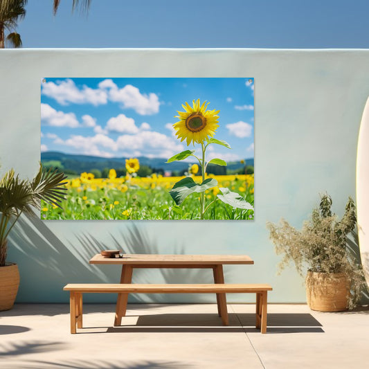 Veld vol zonnebloemen onder helderblauwe hemel tuinposter