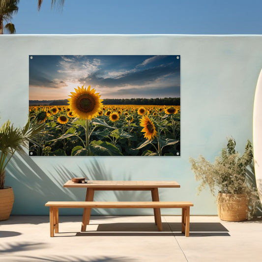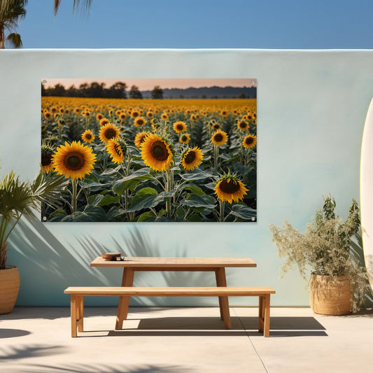Uitgestrekt zonnebloemveld bij zonsondergang tuinposter