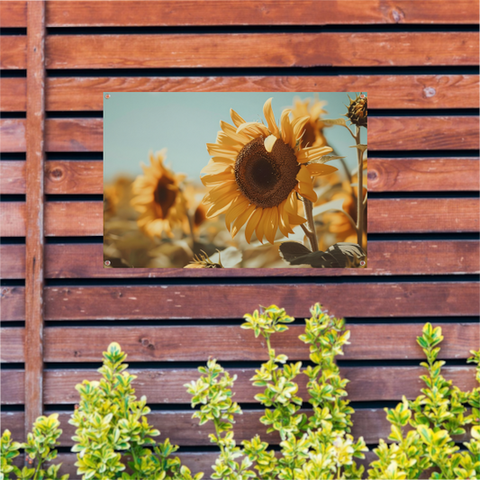 Zonnige dag met bloeiende zonnebloemen tuinposter