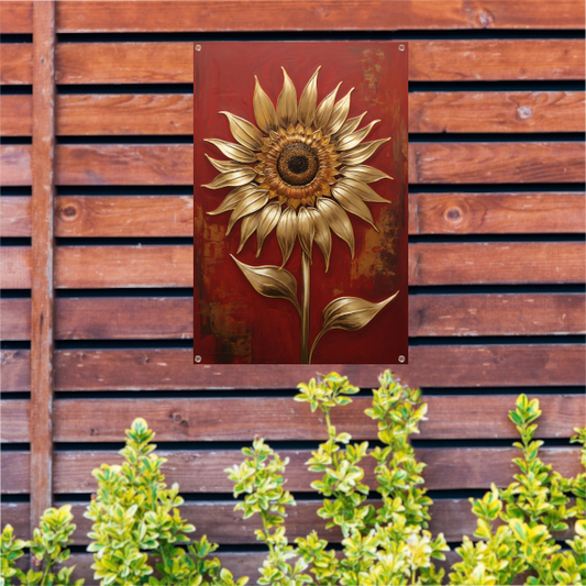Gouden Zonnebloem op Dieprode Achtergrond tuinposter