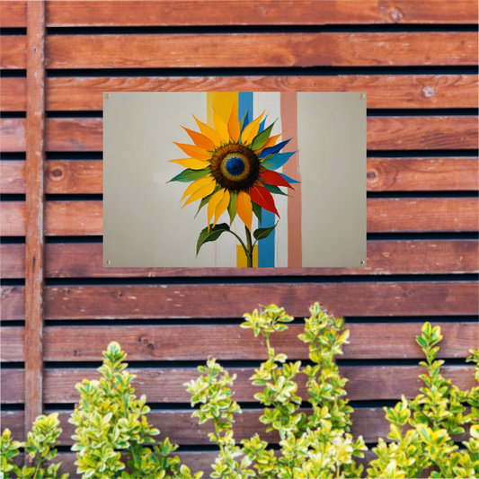 Abstracte Kleurrijke Zonnebloem op Gestreepte Achtergrond tuinposter