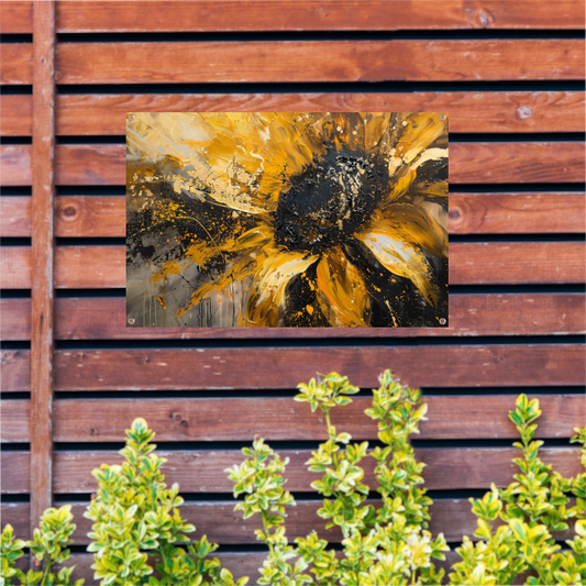 Dynamische abstracte zonnebloem in goud en zwart tuinposter
