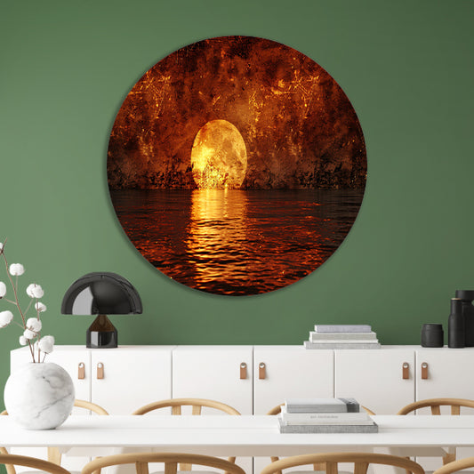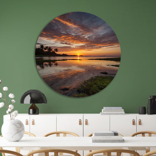Adembenemende zonsondergang weerspiegeld in water aluminium muurcirkel