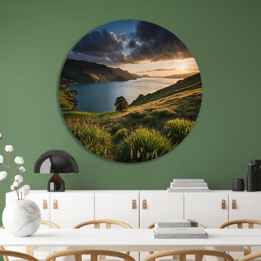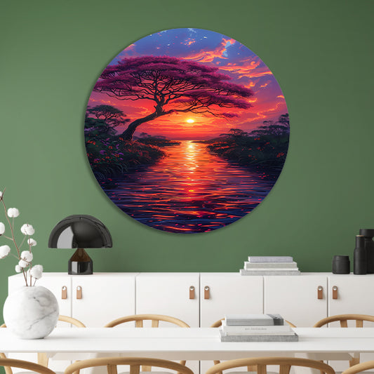 Zonsondergang achter majestueuze boom in landschap aluminium muurcirkel
