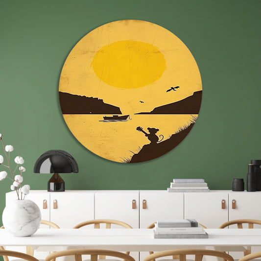 Silhouet van Muis met Gitaar bij Zonsondergang aluminium muurcirkel