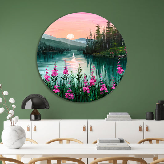 Roze zonsondergang bij rustig bergmeer met bloemen aluminium muurcirkel