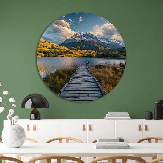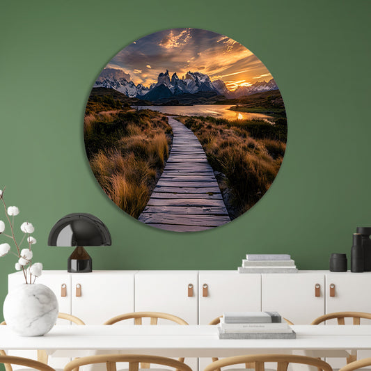 Houten pad naar bergen in schitterend landschap forex muurcirkel