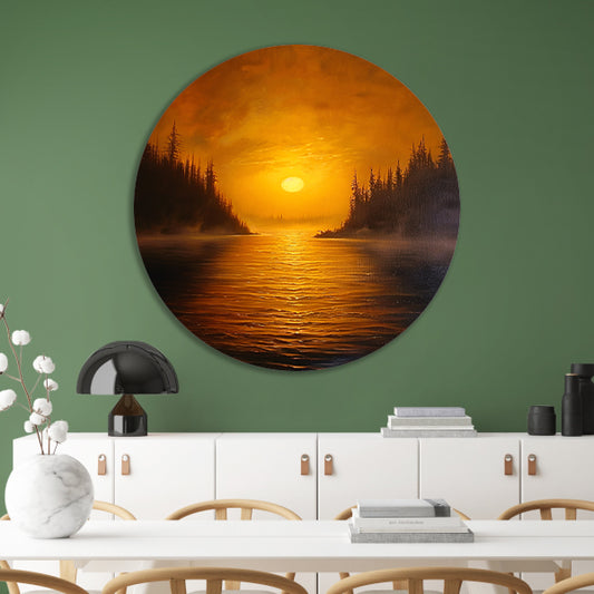 Kleurrijke zonsondergang boven kalm water schilderij aluminium muurcirkel