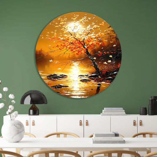 Stralende herfstboom bij zonsondergang met reflectie aluminium muurcirkel