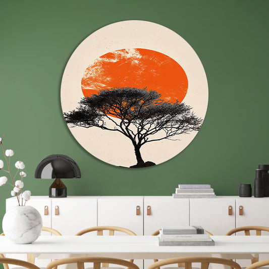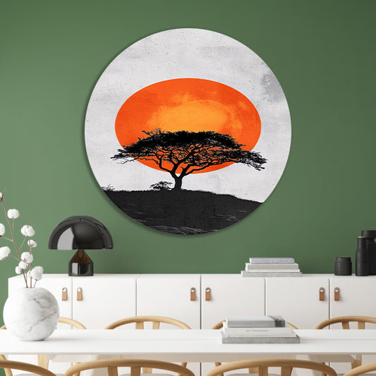 Minimalistische boom en zon in krachtige contrasten aluminium muurcirkel