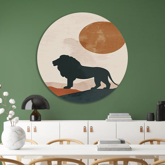 Leeuw silhouet tegen oranje zon in minimalistische stijl aluminium muurcirkel