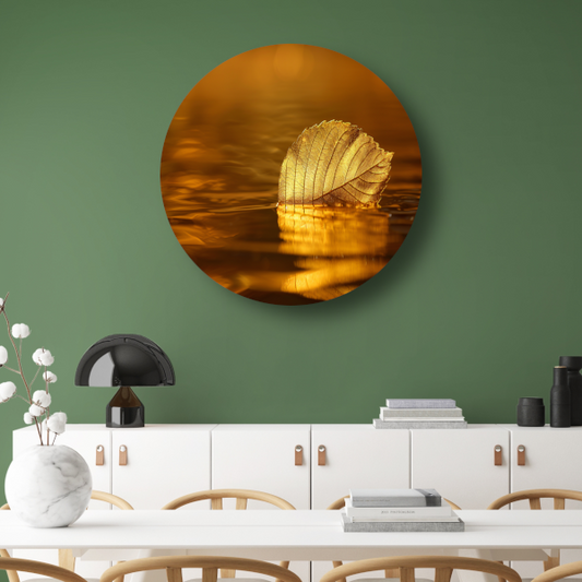 Gouden blad op kalme wateren bij zonsondergang aluminium muurcirkel