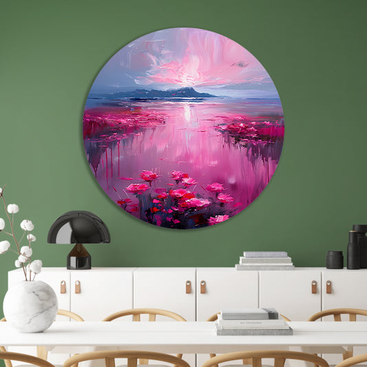 Roze zonsondergang en bloemen aan de waterkant forex muurcirkel