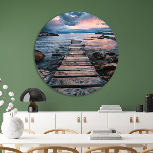 Rustieke houten steiger tijdens een kleurrijke zonsondergang forex muurcirkel