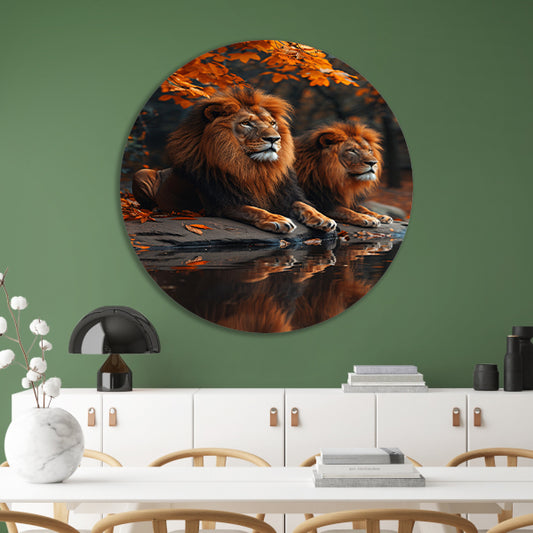 Leeuwen bij zonsondergang aluminium muurcirkel