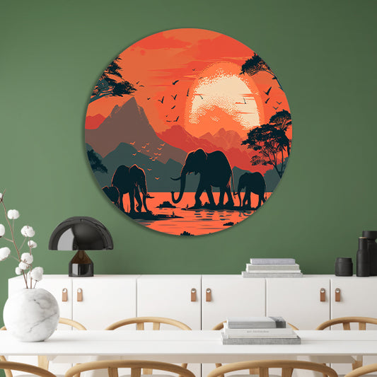 Silhouet olifant zonsondergang aluminium muurcirkel