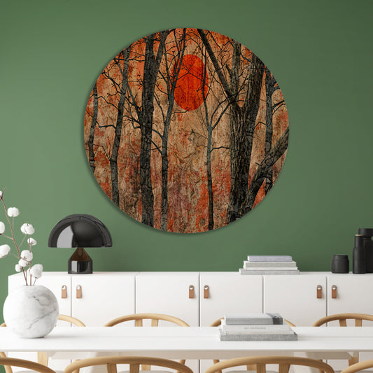 Warme Zonsondergang met Bomen en Gras aluminium muurcirkel