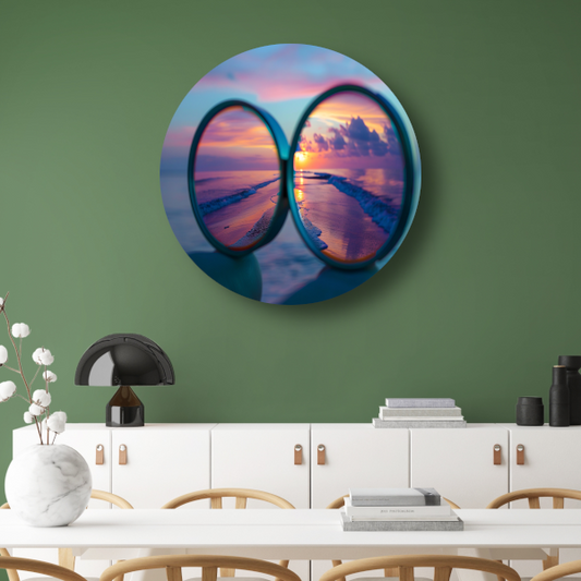 Reflectie van zonsondergang in brilglazen aluminium muurcirkel