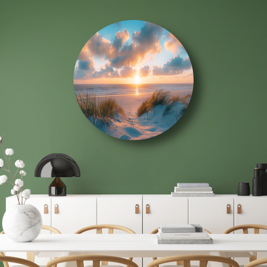 Betoverende zonsondergang op het strand met levendige kleuren forex muurcirkel