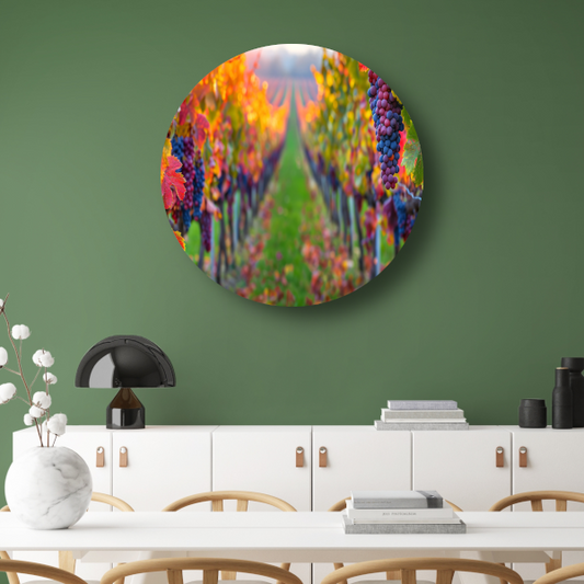 Herfstzonsondergang in levendige wijngaard aluminium muurcirkel