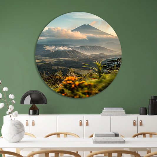 Vulkanisch landschap met bloemen bij zonsopgang forex muurcirkel