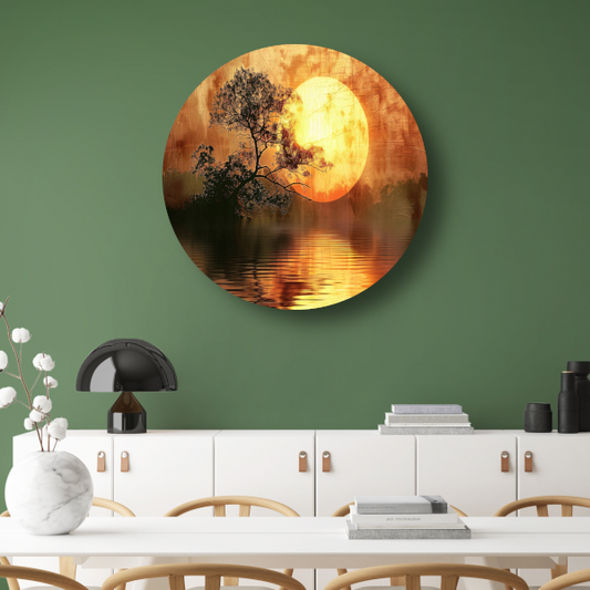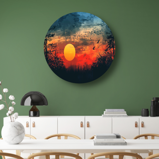 Stralende zon boven kleurrijke abstracte velden aluminium muurcirkel