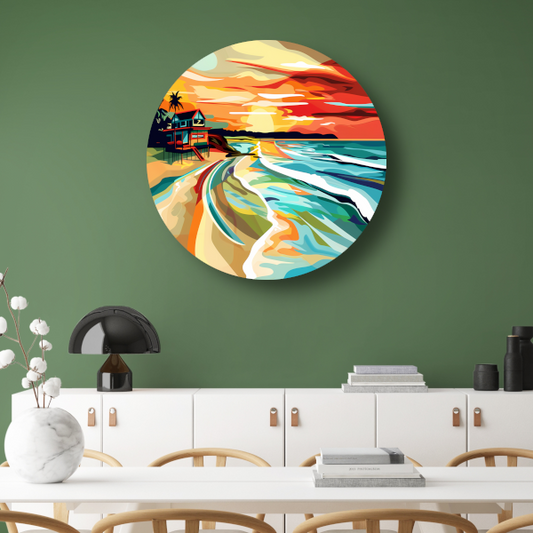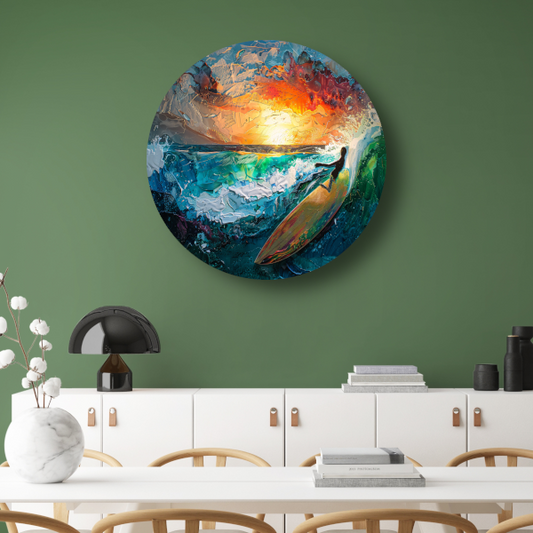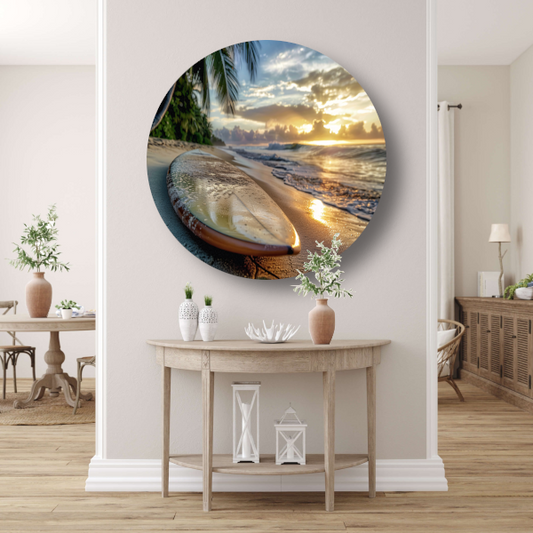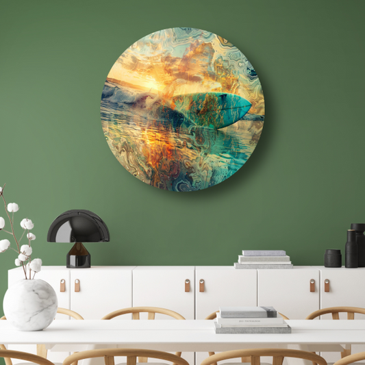 Kleurrijke Surfplank in Glinsterende Zee bij Zonsondergang forex muurcirkel