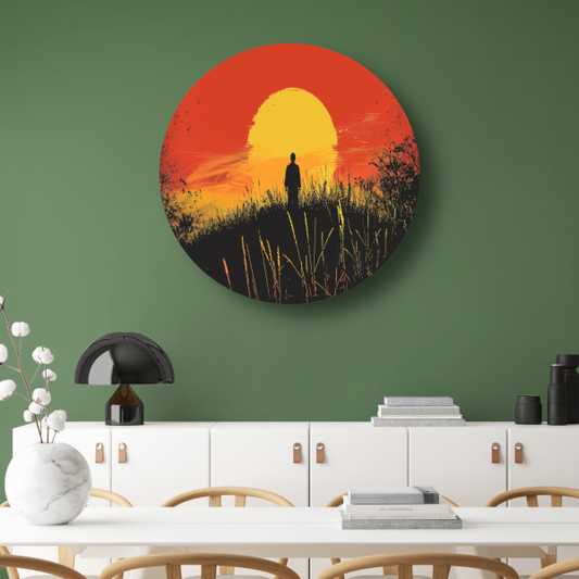 Persoon Contempleert Zonsondergang in Vurig Landschap forex muurcirkel