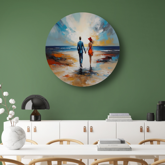 Romantische Strandwandeling met Kleurrijk Paar aluminium muurcirkel