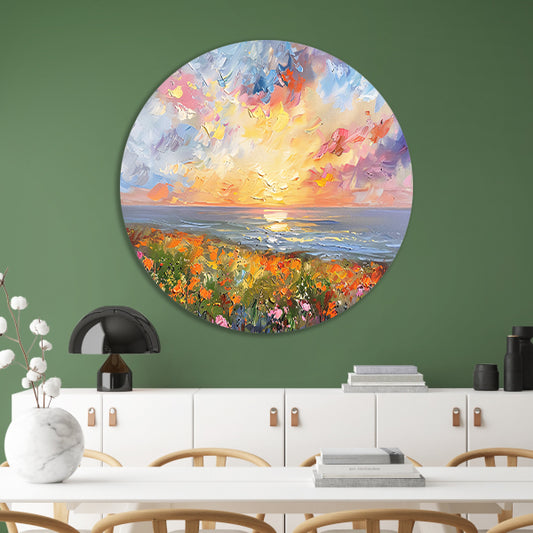 Abstracte zonsondergang met bloemen en oceaan aluminium muurcirkel